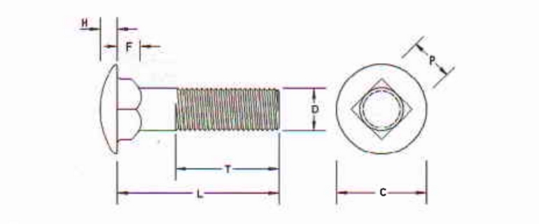 A Carriage Bolt, also known as a Coach Bolt, has a domed or countersunk head, and the shank is topped by a short square section under the head. The square section grips into the part being fixed (typically wood), preventing the bolt from turning when the nut is tightened.